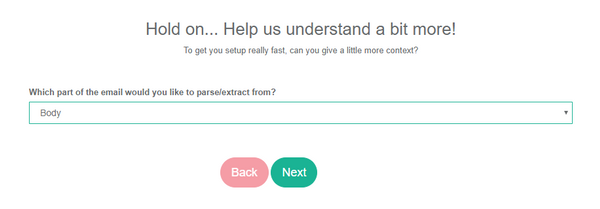 4. Once you have forwarded the email to the assigned email address (ending in mg.parserr.com), Parserr will detect the email and then ask you a few onboarding questions. In our case we would like to extract information from the body of the email: