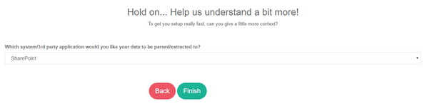 6. Next Parserr asks us where we’d like to extract our data. Choose SharePoint and click “Finish”.