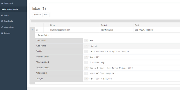 9. Once you have your rules sorted, go have a look at your parsing results. You do this by clicking on “incoming emails” in the left navigation and click the small arrow icon to open your first email: