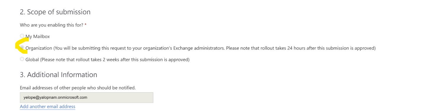 - Finally, the email of the person that is going to approve it. Normally, the Exchange Administrator