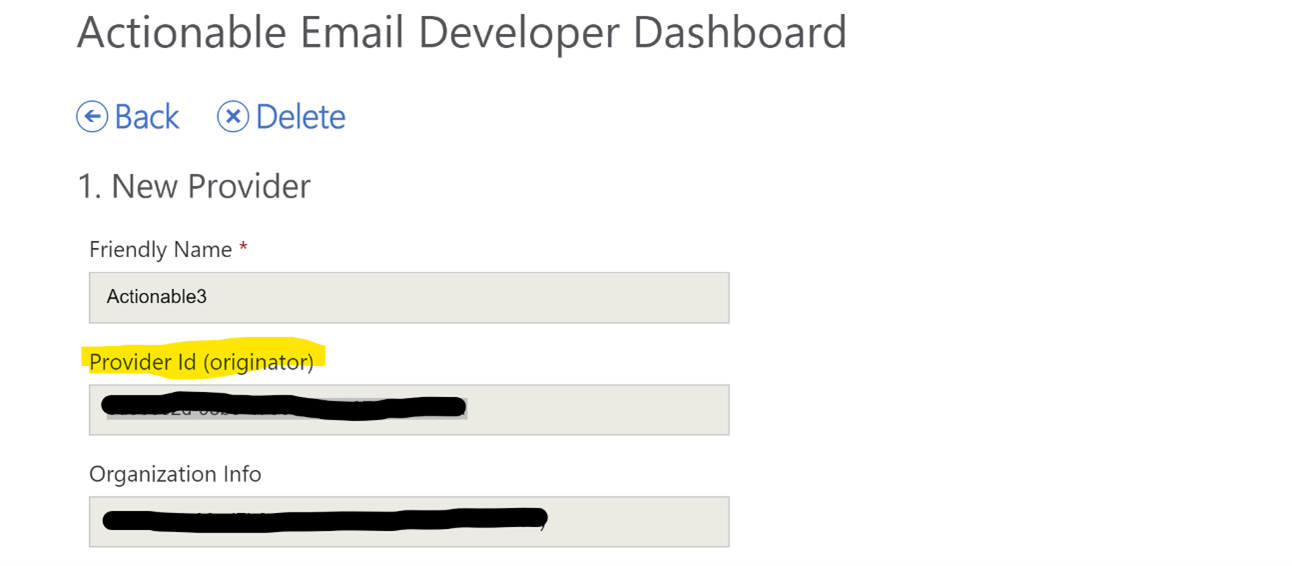- Sender email address: Add the emails that you are going to use to send the actionable messages (Include the email group if you want to use a group)