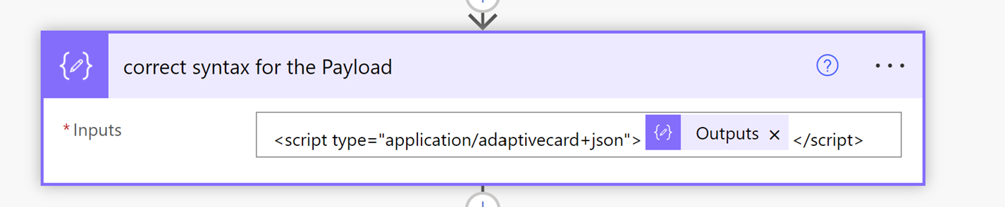 <script type=”application/adaptivecard+json”>”Compose output” </script>