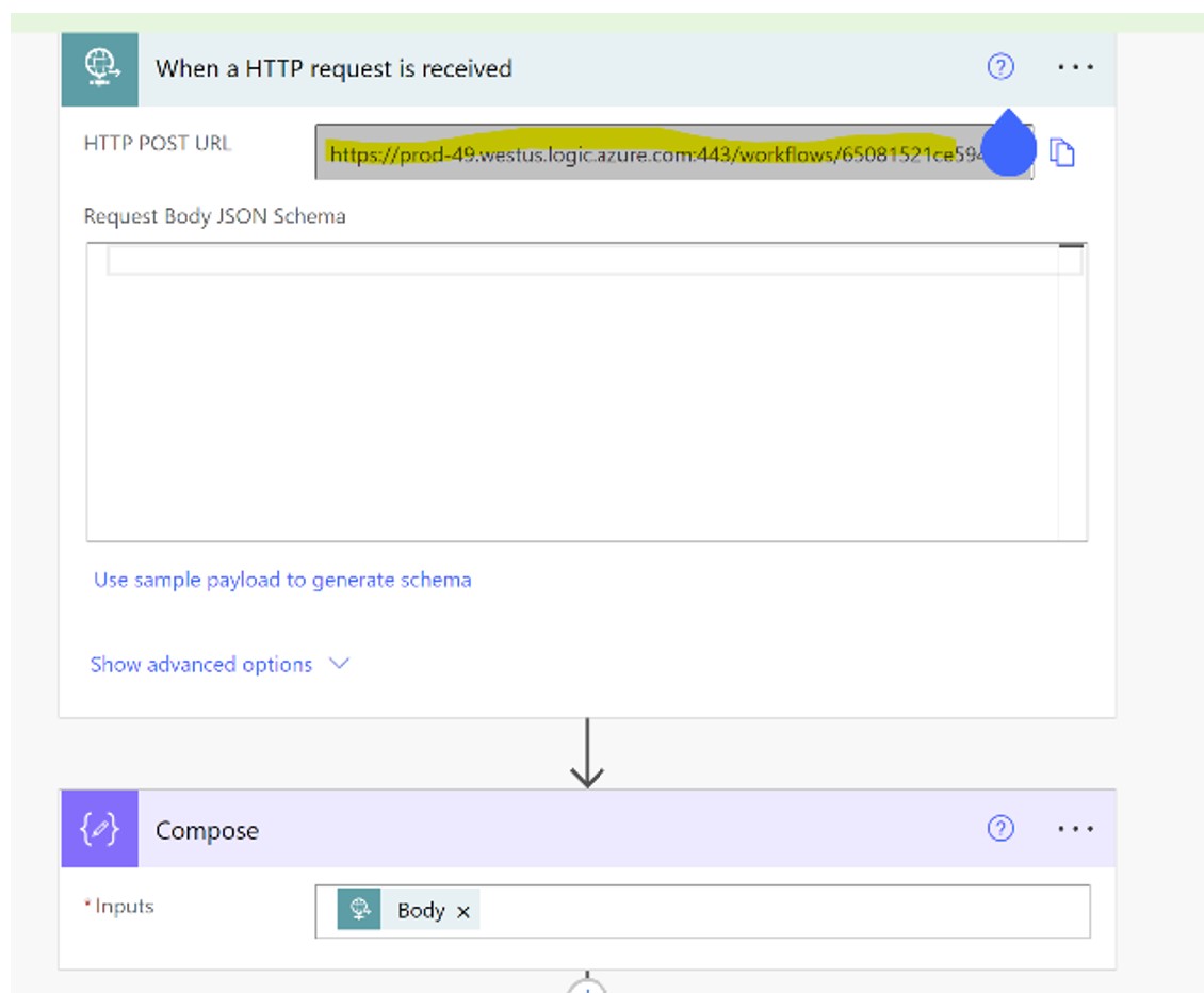 "url": "https://prod-00.westus.logic.azure.com:443/workflows/.... this is the URL that you took from the flow",
