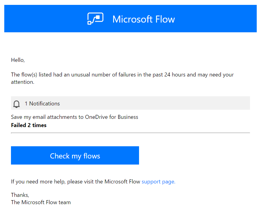 In addition, these failure emails will only be sent once a week — so if you have a flow that fails many times a week we won’t send you a bunch of emails. As a result, if there is a particular flow that is very important, and you want to be notified on every single failure, we still would recommend explicitly setting up a notification error-handling step.