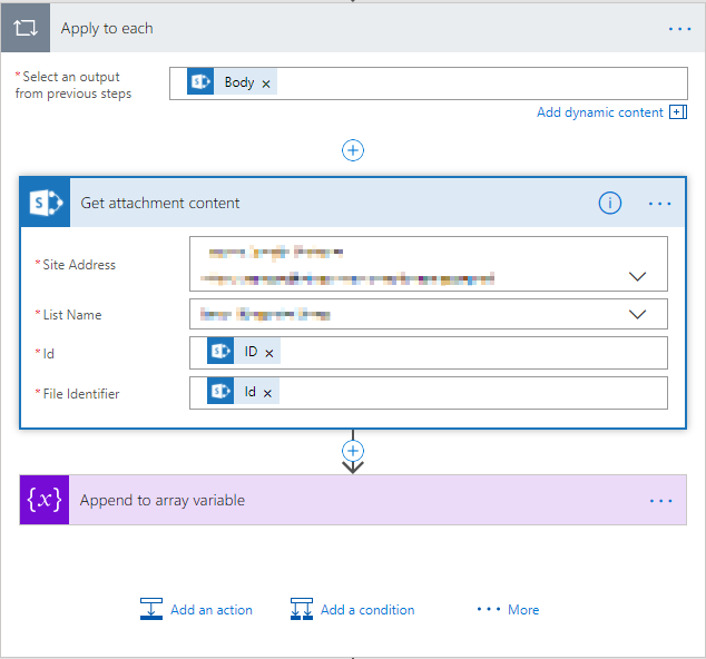 Next add “Get attachment content” action inside the loop. The SP site name and list name don’t change.