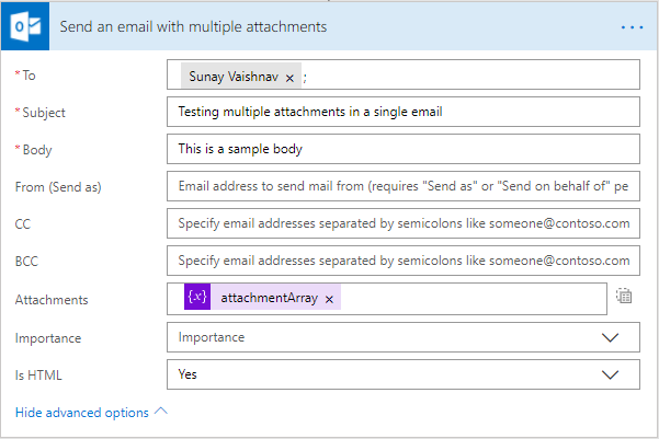 Our array, contains the attachment item with two properties – Name and ContentBytes. We are assigning the DisplayName, retrieved from “Get Attachments” action to the Name property and the Attachment Content, retrieved from “Get Attachment Contents” action to the ContentBytes property.