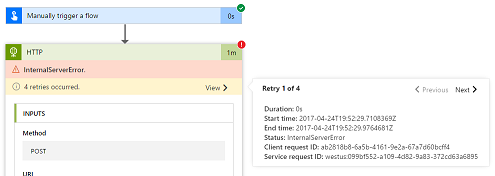 Now, when you click on a particular flow run you can expand the actions that failed, and see exactly how many automatic retries occurred, as well as the exact details of what happened in that retry.
