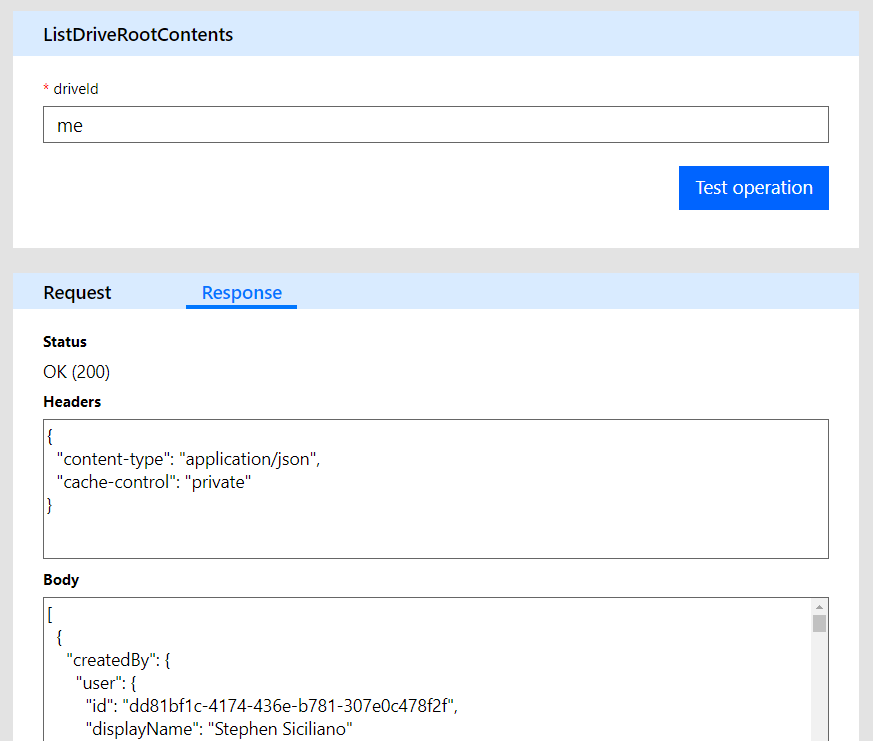 The third new feature for custom connectors is there is a rich experience for testing. Select the Test tab and you’ll see a list of your operations. For each operation you can provide some inputs and you’ll see the exact request and response for your custom connector.