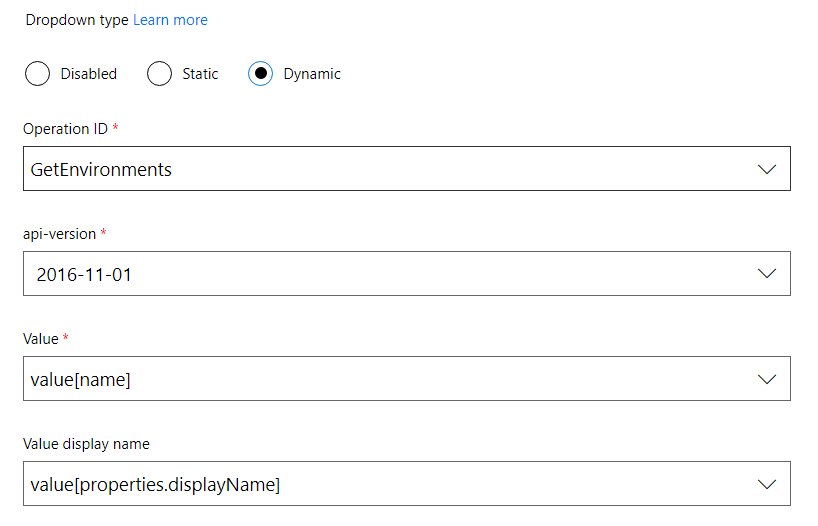There are several new capabilities in the Custom Connector experience. First, you can create dynamic dropdowns. Dynamic dropdowns are used when the set of items in a list can change depending on the user. For example, every SharePoint site can have a different set of Lists in it. Or, every person has access to a different set of Microsoft Teams channels. To create a dynamic dropdown, you will need to have defined an operation on your API that returns the list of items you want to include. Once you have this operation, select Dynamic on the operation type and choose the Operation ID for that operation.