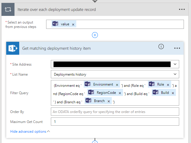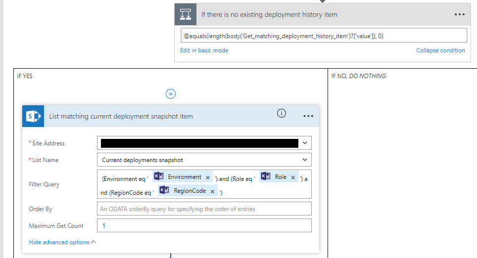 We determine whether a corresponding item is in the Deployment history list by checking the length of the item list returned by the above action. If the length is 0 – which means no corresponding item was found in the Deployment History list – we then try to find the corresponding item in the Current Snapshot list. This is again done by using an ODATA filter to find an exact match. Since the Current Snapshot list was initially created to have one item per Environment, Role, and Region, we will always find one unique record.