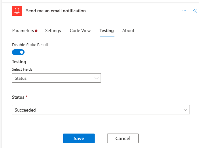 - Disable an action or set static (mock) outputs for an action – In the new designer, if you want to disable an action rather than remove it, navigate to Testing tab of the action and enable ‘Static Outputs’ and set it to 200 Succeeded. This essentially treats the action as successful without actually running the action. Similarly, if you want to see how your flow reacts if a certain action fails with a code/succeeds with a code, you can use the same capability of ‘Static outputs’ available on the action to mock the action execution to your needs.
