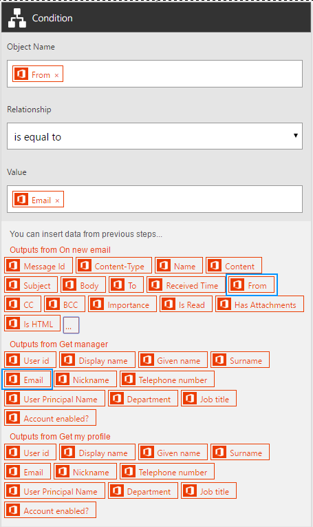 Then, using the Office 365 Users connection, I can programmatically find out my manager’s email address and set up a condition to occur only if the sender matches with my manager’s email address.