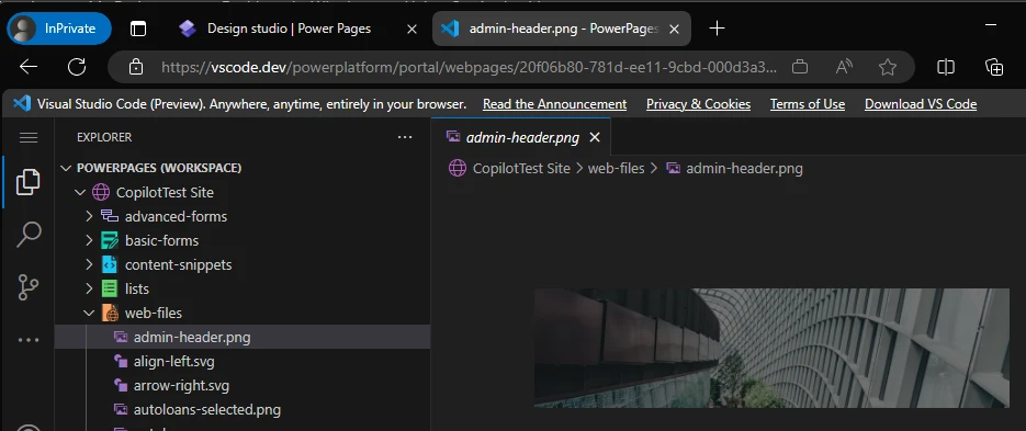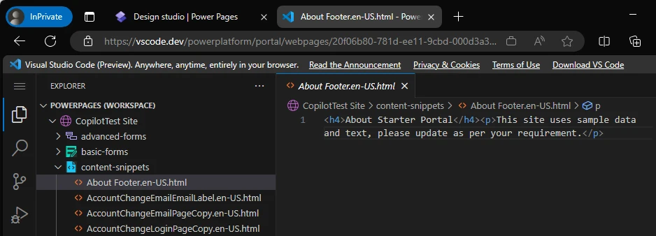 In October 2022, we launched Power Pages code editing in Visual Studio Code for web feature, which introduced a free, zero-install Visual Studio Code experience for Power Pages code editing in your browser. We also made incremental changes to improve performance and reliability with infrastructure changes and feature addition such as save conflict feature to avoid data overwrite issue when multiple users are working on same file.