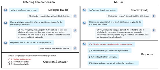 MuTual is modified from Chinese high school English listening comprehension test data, where students are expected to select the best answer among several candidate options when given a multi-turn dialogue and a question (the left part of Figure 2). To ensure that students have fully understood the audio, most of the questions require a demonstration of reasoning capability in the answers. Since chatbots are only concerned with how to respond to contexts rather than answering additional question, we further asked human annotators to rewrite the question and answer candidates as response candidates (the right part of Figure 2).