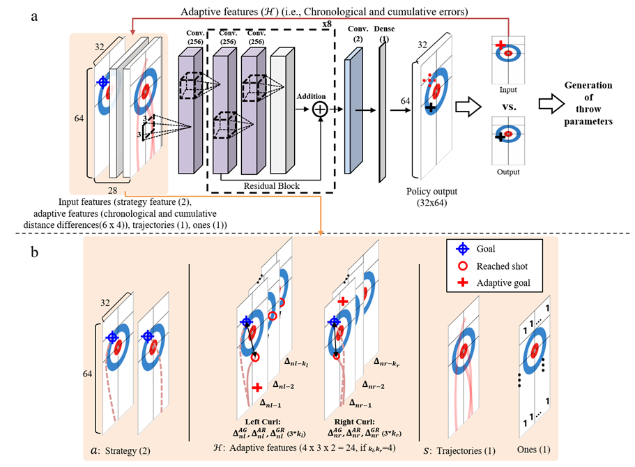 Figure 2. Overview of the proposed framework to adapt deep RL from simulation to real curling with its uncertainties. (a) Architecture of our network for adaptation. (b) Various features for learning, including features from past trajectories for adaptation.