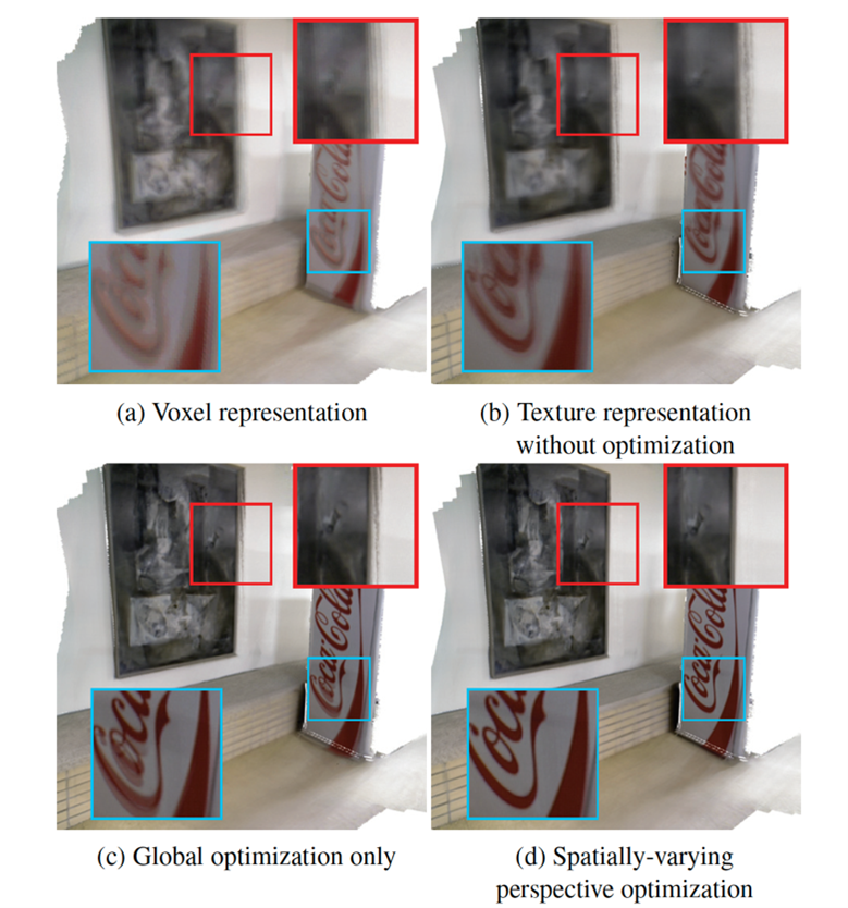 Figure 1. This figure compares per-voxel color representation (a) with conventional texture representation without optimization (b). Compared with global optimization only (c), the proposed method (d), so-called TextureFusion, can achieve high-quality color texture in real-time RGB-D scanning.