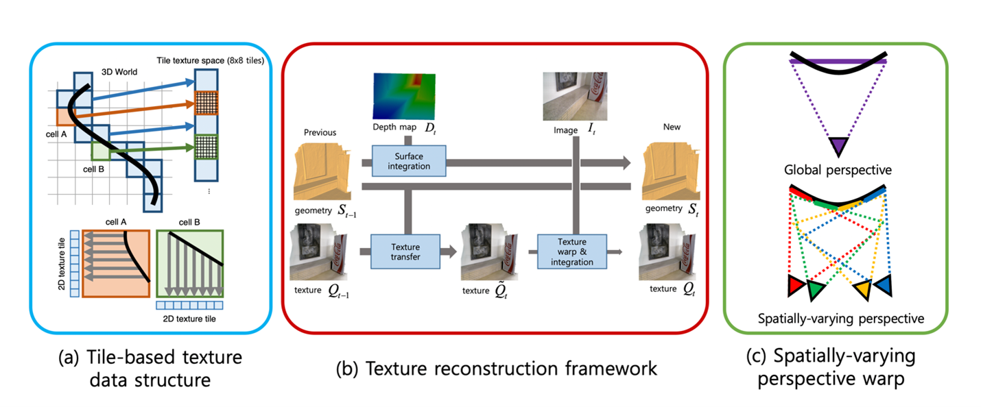Figure 2. The researchers enables real-time texture fusion by proposing (a) a tile-based texture data structure, (b) a real-time texture reconstruction framework, and (c) spatially-varying perspective warp for real-time 3D scanning.