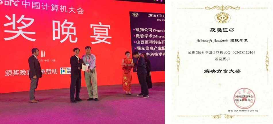 At CNCC2016 (opens in new tab), the annual conference of China Computer Federation (CCF (opens in new tab)) in Taiyuan, the “Best Solution Award of 2016” was awarded to Microsoft Academic. We’re honored that the organizing committee and more than 5,000 attendees voted this solution the best of more than 80 technology exhibitions. Dr. Kuansan Wang, managing director of Microsoft Research Outreach, accepted the award for this project, which enables researchers to find and rank academic papers and their own academic profiles.