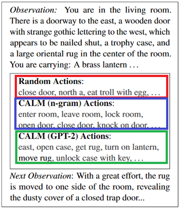 CALM (short for Contextual-Action Language Model) avoids the use of the valid-action handicap altogether by using a language model to generate a compact set of candidate actions. CALM starts from a pretrained GPT-2 model  (opens in new tab)and is fine-tuned on a corpus featuring years of human-gameplay transcripts spanning 590 different text-based games. During this training process, CALM is instilled with priors that humans use when playing a large variety of text-based games.