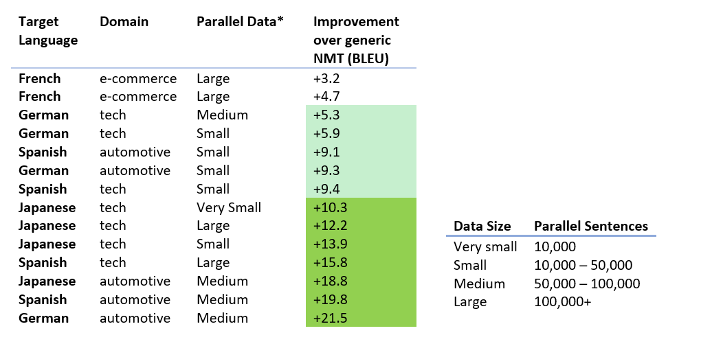 Below are a few examples of BLEU score (an industry standard translation quality measure) improvements for various datasets size and content type. The improvement in quality over the default NMT system can vary from a few to more than 10 BLEU points.