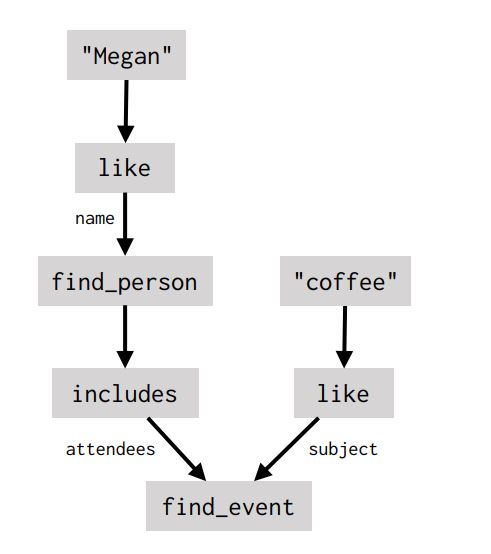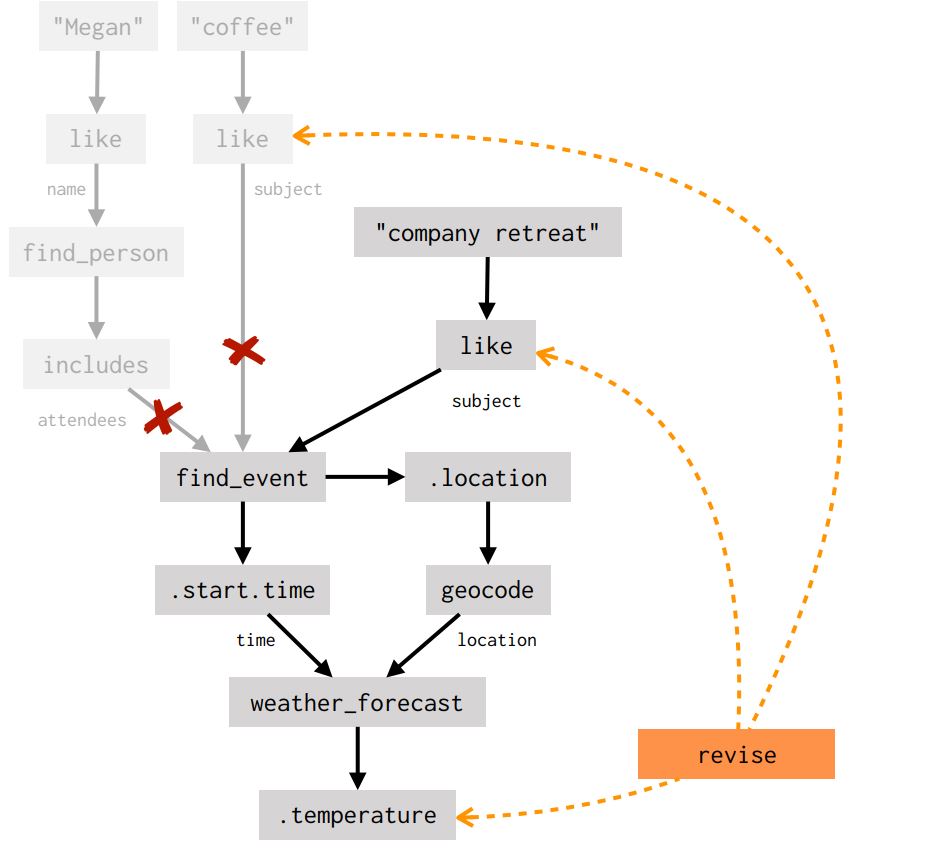 But what about more complicated requests, like What’s the temperature going to be like when I get coffee with Megan? Answering this question requires a dialogue agent to do a series of different things: figure out who Megan is, look up the event with Megan in a calendar application, figure out its start time, and use the time to query a weather service. Rather than requiring system builders to create a specialized weather_during_event_with_person intent, we translate the natural-language request into a program that ties all of these calls together. We represent this program as a dataflow graph that explicitly defines data dependencies (edges) between the steps (nodes) in the dialogue agent’s plan: