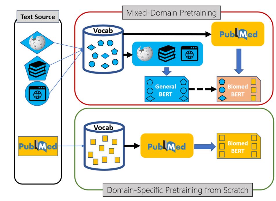 This strategy is not in conflict with pretraining a generic all-encompassing language model. Indeed, the two complement each other and are applicable in different situations. In many open-domain applications (such as search, ads, productivity suites, and others), one can’t anticipate the domain for the application instances. Therefore, a general language model accounting for as many domains as possible is mandatory. On the other hand, for applications in a specialized domain with abundant text, domain-specific pretraining is superior and desirable. In biomedicine, prominent examples include extracting PubMed-scale knowledge graphs and compiling population-level real-world evidence from electronic medical records.