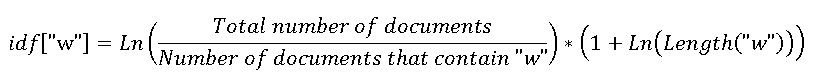 While the extra length term deviates from more traditional definitions (opens in new tab), I found the discriminative power of this approach to be better than several other variations tested. - Using the formula above, also compute and store the idf[a] collection for all words in the corpus.