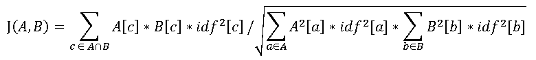 The resulting metric, J(A,B), is the vocabulary similarity between the sets of documents A and B, ranging from 0 (totally different) to 1 (exactly the same).
