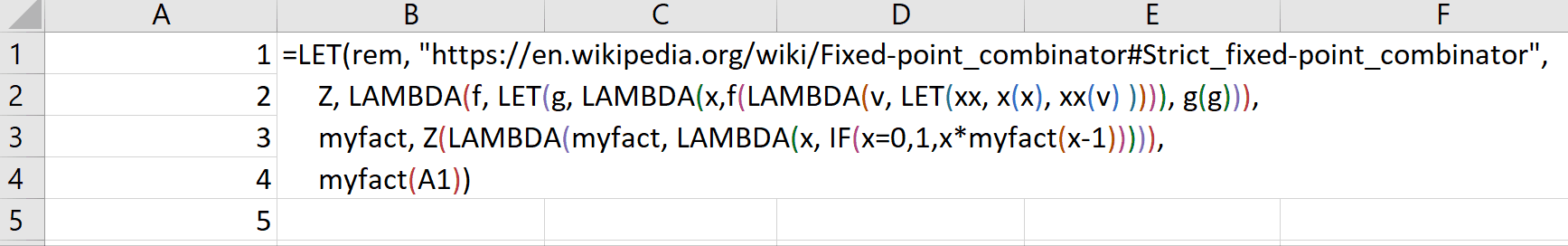 Even without relying on a recursively defined name, the formula language is Turing-complete because we can encode recursive function definitions using the classic call-by-value fixed-point combinator. In fact, running this combinator was one of the early stress tests of LAMBDA in the Excel codebase. Here it is, applied to define a factorial function.