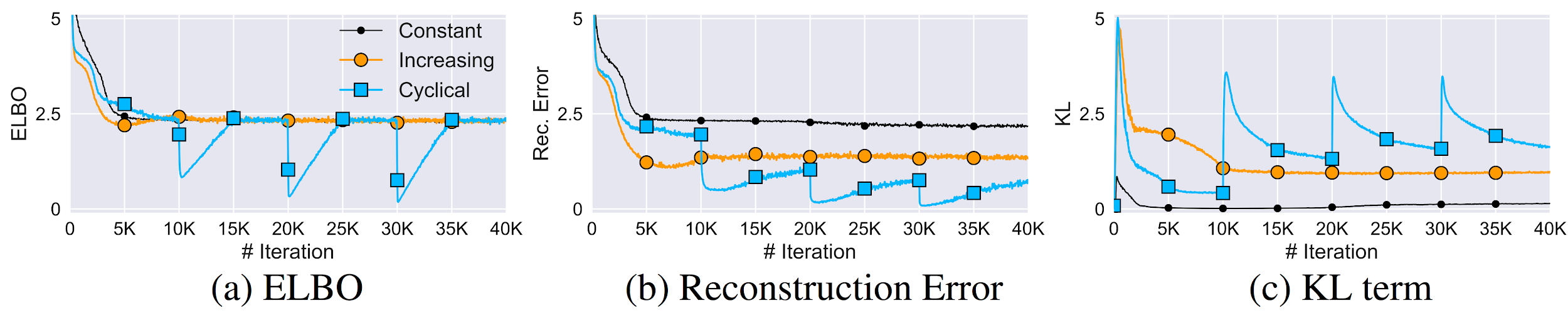 The learning curves for the VAE objective (ELBO (opens in new tab)), reconstruction error, and KL term are shown in Figure 4. The three schedules share very similar ELBO values. However, the cyclical schedule provides substantially lower reconstruction error and higher KL divergence. Interestingly, the cyclical schedule improves the performance progressively; it becomes better than the previous cycle, and there are clear periodic patterns across different cycles. This suggests that the cyclical schedule allows the model to use the previously learned results as a warm-restart to achieve further improvement.