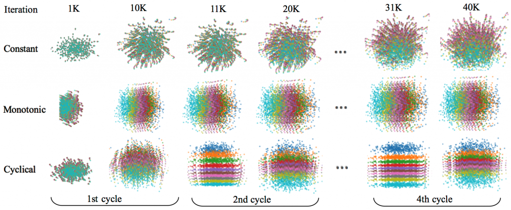 • The cyclical schedule behaves similarly to the monotonic schedule in the 1st cycle. But starting from the 2nd cycle, much more divided clusters are shown when learning on top of the 1st period results. However, β<1 leads to some holes between different clusters. This is alleviated at the end of the 2nd cycle, as the model is trained with β=1. As the process repeats, we see clearer patterns in the 4th cycle than the 2nd cycle for both β<1 and β=1. It shows that more structured information is captured in z, using the cyclical schedule.