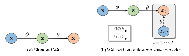 Figure 1: Illustration of information flows on (a) one path in a standard VAE, and (b) two paths in a VAE with an auto-regressive decoder.