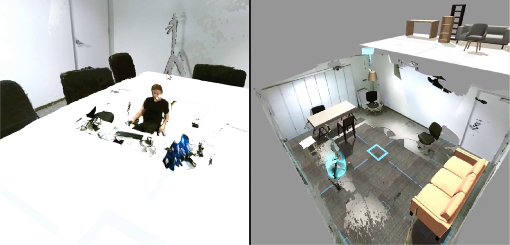 Figure 5. Showing remote content – in this case a user sitting at a remote desk with a ceiling-mounted Kinect camera. Right shows a remodeled room. The desk and the couch are virtual objects, while the table in the middle has been erased. This configuration features teleportation to arbitrary viewpoints. In this case, the user teleported to one top corner of the room to get a bird’s eye view on the scene.