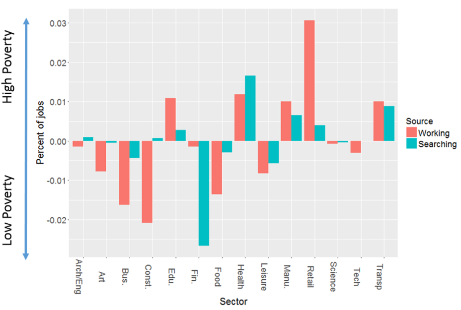 Figure 2. – Job searches vs. jobs held, by employment sector, as related to poverty level across U.S. counties. Higher/lower bars indicate a skew toward higher/lower poverty counties. For instance, the percent of jobs in the retail sector skew by about 3% toward higher poverty counties, while the skew of searches for retail jobs skews toward higher poverty counties by only about half of one percent.