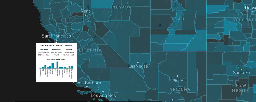 Broadly speaking, high population counties correspond to urban environments that may offer more options for employment, particularly in “new economy” areas such as the technology sector. Our research corroborated this, showing significantly more searches for business, finance, and technology jobs among others, in counties in the top quartile of population. Conversely, we see more searches for construction, education, manufacturing, and transportation jobs in counties in the bottom quartile of population. As shown in Figure 1, where each dot represents a U.S. county, we also see that as population increases (x-axis) the diversity of job searches increases (lower values on the y-axis), indicating that people in more populated areas at least feel that there is a wider array of job opportunities. However, once a county hits a population of about 50,000, that job search diversity levels off, potentially suggesting an inflection point for job diversity as a function of population.
