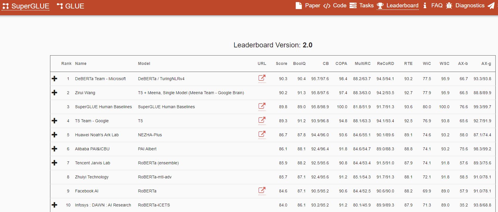 Since its release in 2019, top research teams around the world have been developing large-scale pretrained language models (PLMs) that have driven striking performance improvement on the SuperGLUE benchmark. Microsoft recently updated the DeBERTa model by training a larger version that consists of 48 Transformer layers with 1.5 billion parameters. The significant performance boost makes the single DeBERTa model surpass the human performance on SuperGLUE for the first time in terms of macro-average score (89.9 versus 89.8), and the ensemble DeBERTa model sits atop the SuperGLUE benchmark rankings, outperforming the human baseline by a decent margin (90.3 versus 89.8). The model also sits at the top of the GLUE benchmark rankings with a macro-average score of 90.8.