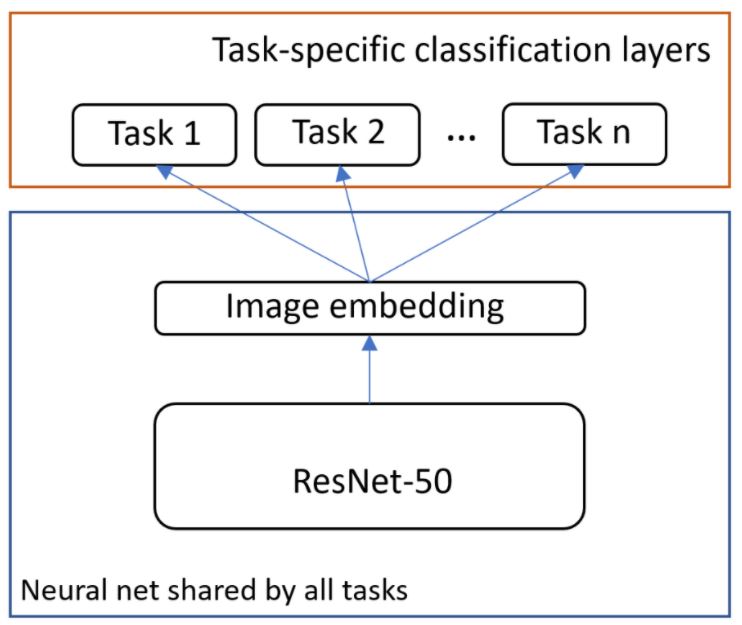 We chose to use multi-task learning with hard parameter sharing (see figure above). Single neural networks will optimize each classification problem at the same time. By using tasks of varied sizes—up to 40 million images with 100,000 different labels from web-supervised sources—Microsoft Vision Model ResNet-50 can achieve high robustness and good transferability to different domains.