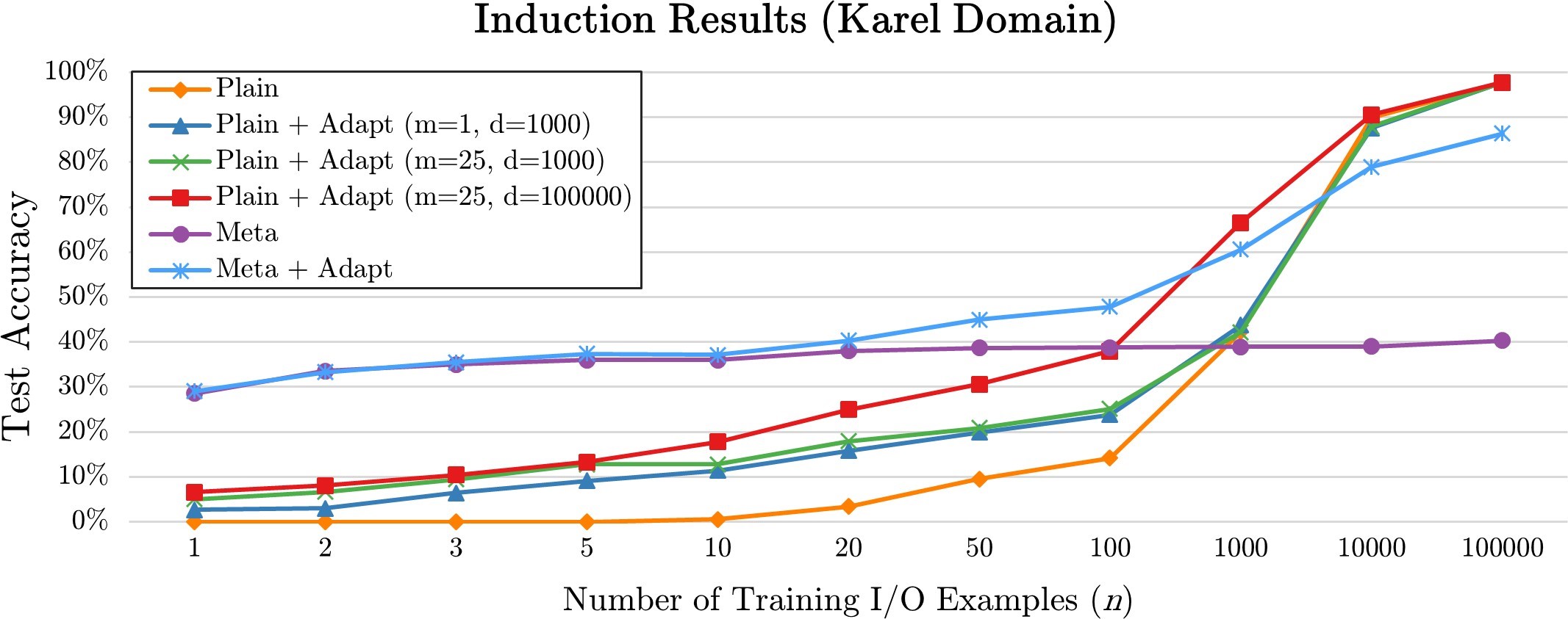 As detailed in our recently published paper, the results are quite promising: one of our meta induction techniques achieved an accuracy of nearly 40% with fewer than 10 examples (compared to 0% using the PLAIN example-driven technique alone).