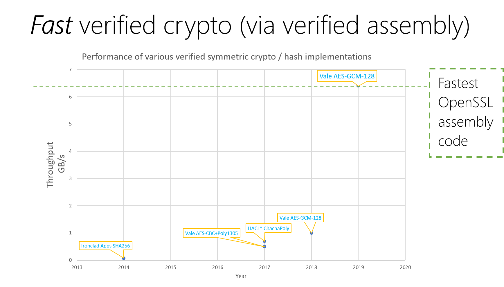 Project Everest is a case in point: We produce verified cryptographic routines, parsers, and protocols that are deployed in production settings with strong correctness and security guarantees and great performance. Our recently released EverCrypt cryptographic provider consists of 23,000 lines of verified C code and 18,000 lines of verified assembly code extracted from 107,000 lines of code and proof in the F* programming language and proof assistant—a development effort of roughly three person-years. The chart below shows the throughput of several verified cryptographic routines since 2014. Over the last five years, there’s been slow but steady improvement, but this year, with EverCrypt, we made a noticeable jump to finally verify the fastest assembly code of OpenSSL (opens in new tab) for AES-GCM, a crypto routine used by 90 percent of secure internet connections.