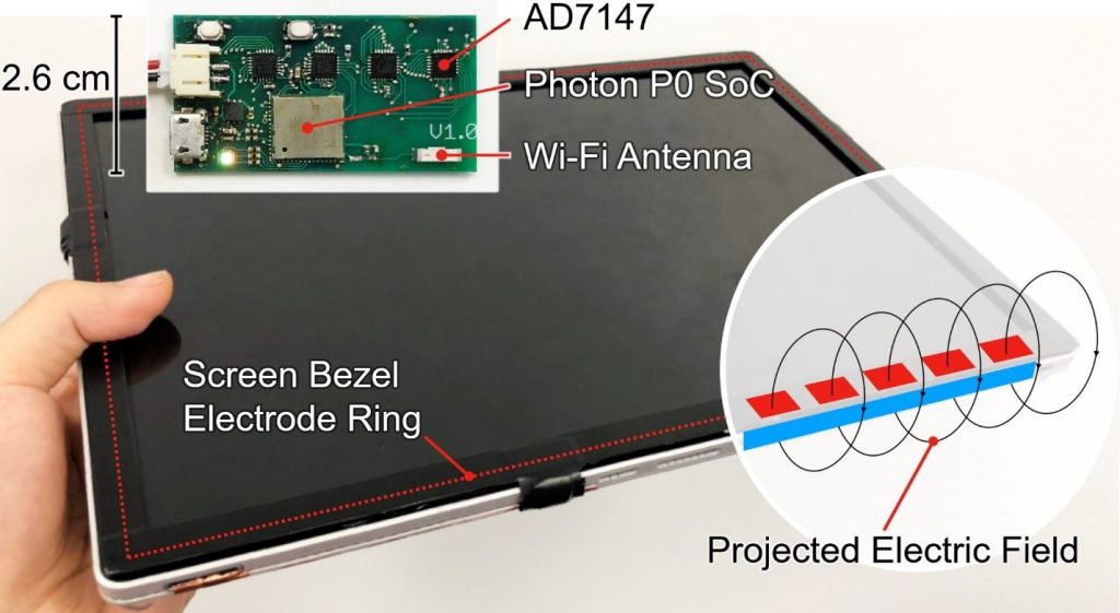Figure 2 – The Peripheral Electric Field Sensor consists of an electrode ring and custom circuitry that can detect when your hands approach or grip the tablet.