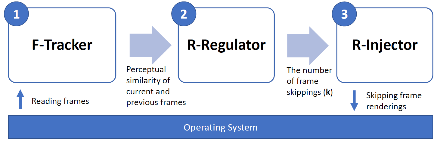The RAVEN system consists of three major components which collectively scale the rate of game-frame rendering: Frame Difference Tracker (F-Tracker), Rate Regulator (R-Regulator), and Rate Injector (R-Injector). The system works in a pipelined fashion. First, F-Tracker measures perceptual similarity between two recent frames. Then, R-Regulator predicts the level of similarity between the current and next frame(s). The prediction is done based on how similar the current frame and the previous frame(s) are. If the next frames are similar enough (determined by a threshold) to the current one, R-Injector limits frame-rendering rates by injecting certain delay in a rendering loop and skip graphics processing for unnecessary frame(s). Presently, RAVEN can skip up to a maximum of three frames, and thus, inflict a frame-rate drop down to 15 FPS.