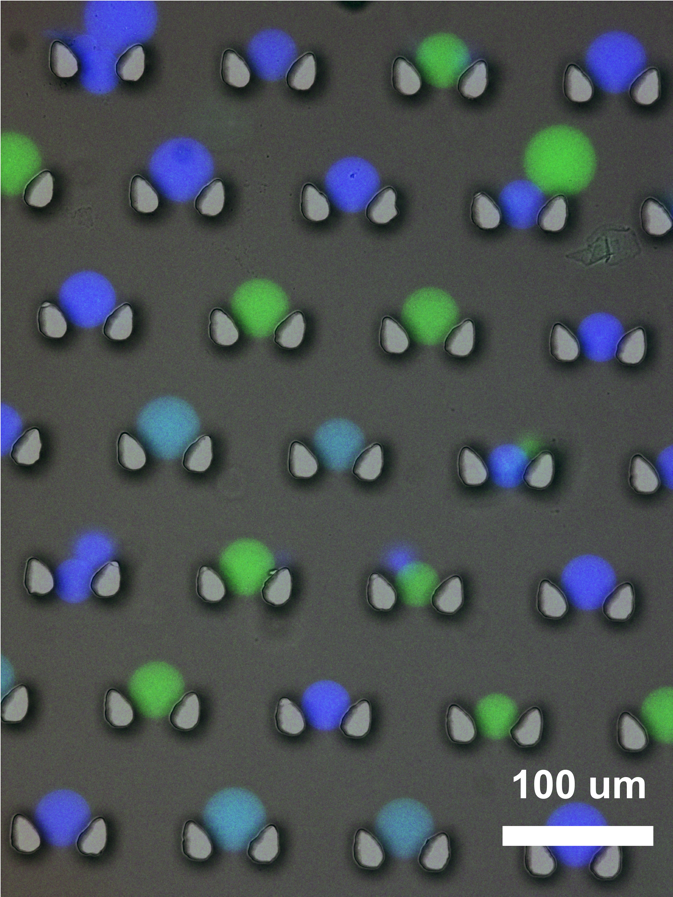Microscopy image showing synthetic protocells used for DNA communication and computing. The different colors—green, dark blue, and blue—represent different computational devices contained within the protocells. The protocells are trapped between pairs of small pillars (gray objects) in a microfluidic device and send messages to each other in a three-layer amplified signalling cascade.