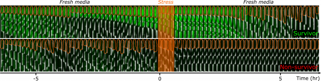 Cells stochastically turn on their stress response and slow down growth to survive future stressful times. A montage of E. coli grown in a microfluidics device illustrates this phenomenon.