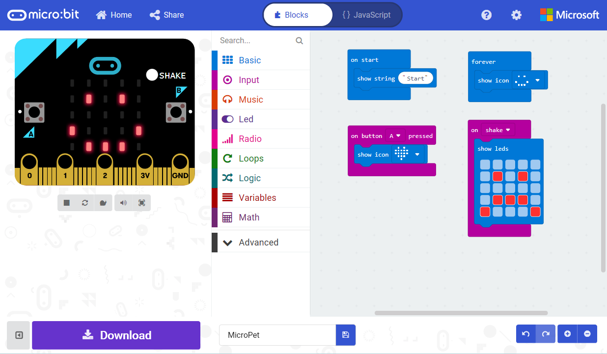 You can use your micro:bit in many different ways on your pet. Here is an example of a program for your Micro:Pet, but be creative and come up with your own unique project!