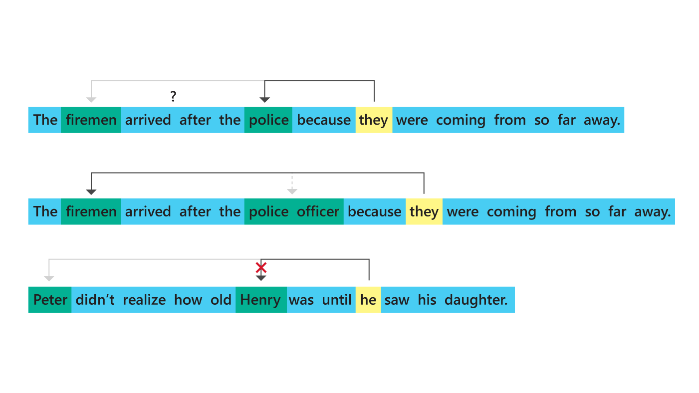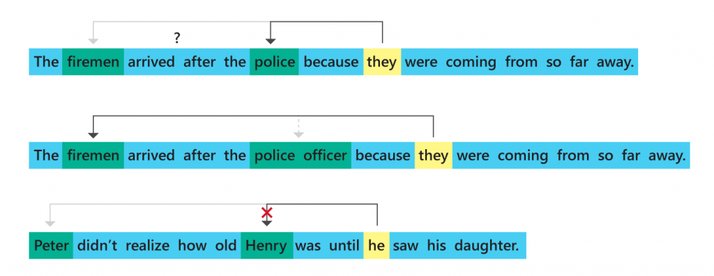 The Winograd Schema Challenge (opens in new tab) (WSC) is a benchmark made up of the trickier kind of coreference, where lexical cues don’t reveal the answer. It was the direct inspiration for KnowRef. The WSC has been called an “alternative Turing test,” garnering considerable attention in the natural language processing and AI communities as a measure of common sense in machines. The last year has seen exciting new approaches to the WSC, from large-scale training of massive language models, like BERT (opens in new tab) and GPT-2 (opens in new tab), to our own approach (opens in new tab) based on knowledge hunting on the web. None has yet come close to human-level performance.