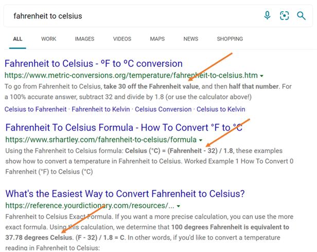 Semantic captions and highlighting can help people more easily determine whether a result is relevant or even provide a direct answer or topic summary. Above is an example from Microsoft Bing of semantic captions and highlighting (the bolded terms) powered by extractive summarization and machine reading comprehension.