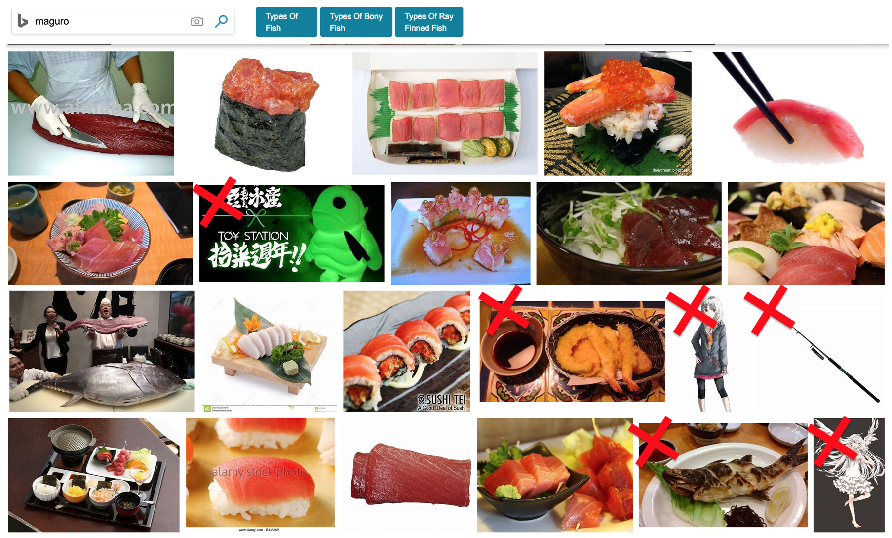 Figure 1 – Bing image search for “maguro” (the Japanese word for tuna). Mislabeled images are marked with a red x.