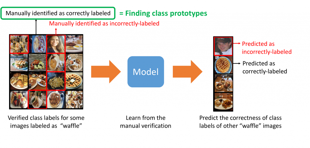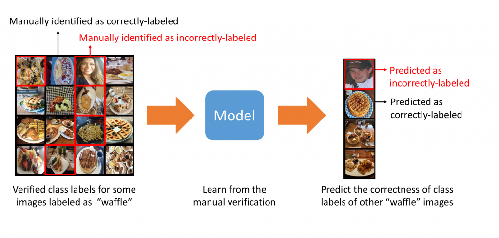 Figure 2 – Learning model manually identifies incorrectly-labeled images among images in the category “waffle” and uses it to predict the correctness of class labels of other “waffle” images.