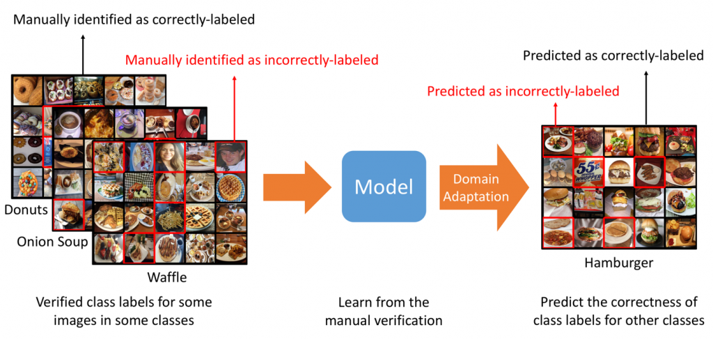 So we strived to reconcile this gap. We wanted the benefit of human supervision but not to have to do this for every category. When asked, what about making this a domain adaptation task and using transfer learning to solve it? More specifically, we wanted to verify images for some classes and transfer the knowledge of “What could be label noise?” to other classes. The task would look like that depicted in Figure 3.