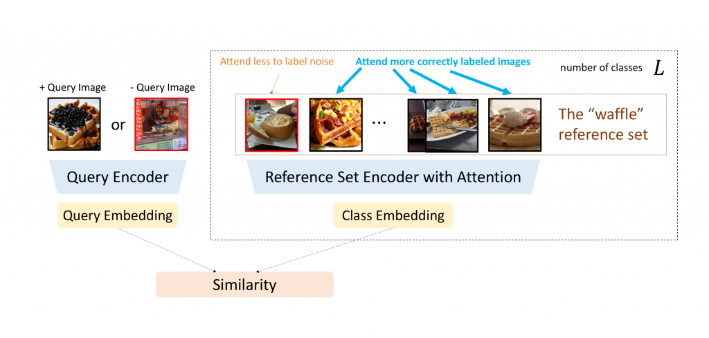 The reference set encoder doesn’t have to learn from human supervision for all classes – it learns to adapt to different reference sets that represent different classes. In this way, we don’t need to provide human supervision for all categories in training, but we are still able to address label noise for all categories.